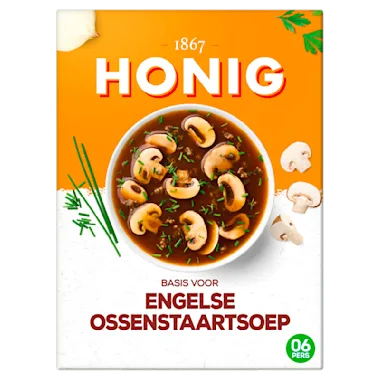 Honig Heldere Ossenstaartsoep is een krachtige, heldere soep. Door het toevoegen van verse ingrediënten maak je zo een heerlijke, zelfgemaakte soep. Deze maaltijdmix is goed voor 6 personen en staat slechts in 10 minuten op tafel. Het enige wat je zelf hoeft toe te voegen zijn 250 g paddenstoelen, 2 eetlepels verse bieslook en 1500 ml water. Bereid de soep zoals de algemene bereidingswijze of vervang de paddenstoelen bij stap 2 door 100g wortel en 4 gesneden lente-uitjes. Dus aan tafel met Honig!