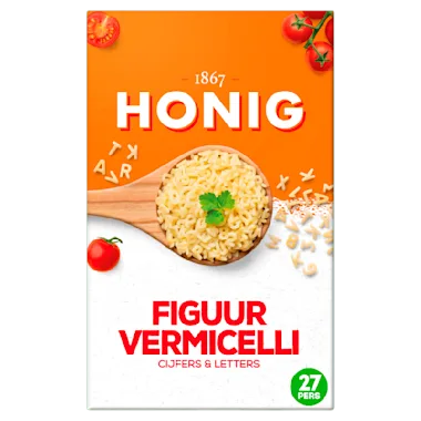 Honig Figuurvermicelli Cijfers en Letters geeft een lekkere vulling aan een verse, zelfgemaakte soep. De vermicelli heeft een stevige bite en geeft een heerlijke twist aan je versgemaakte soep. Door het toevoegen van verse ingrediënten, zoals rundersoepballetjes en cherrytomaatjes, zet je snel en makkelijk een heerlijke, zelfgemaakte soep op tafel! De Figuurvermicelli is geschikt voor 27 personen en staat binnen 10 minuten al op tafel. Snel en gemakkelijk te bereiden met de vertrouwde smaak van Honig. Dus aan tafel met Honig!
