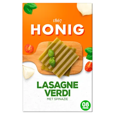De Verdi Lasagnebladen van Honig hebben een golvende vorm, waardoor de saus goed kan worden vastgehouden. De groene kleur wordt verkregen door spinazie die is toegevoegd aan de bladen. Deze portie voor 8 personen staat al binnen 30 minuten klaar!