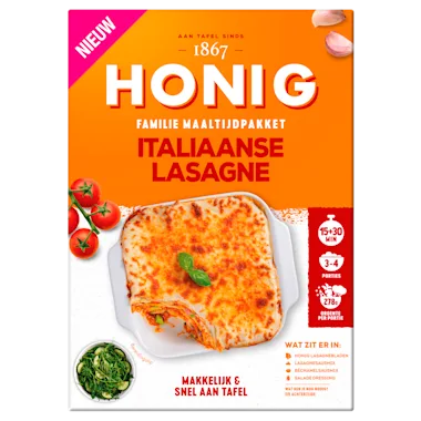 Met Honig Italiaanse Lasagne Familie Maaltijdpakket zet je makkelijk en snel een heerlijke maaltijd op tafel voor de hele familie. In het maaltijdpakket zitten al Lasagnebladen, verschillende Mixen en een Salade Dressing. Je hoeft alleen maar verse ingrediënten toe te voegen en je maaltijd met lekker veel groente is zo klaar!