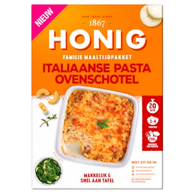 Met Honig Italiaanse Pasta Ovenschotel Familie Maaltijdpakket zet je snel en gemakkelijk een heerlijke maaltijd op tafel.