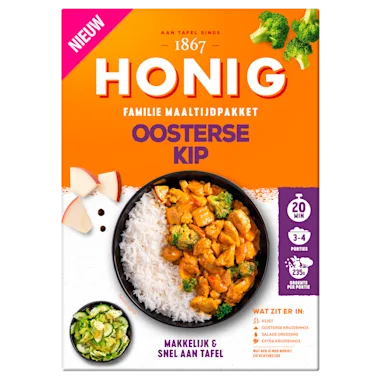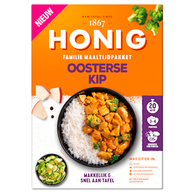 Met Honig Oosterse Kip Familie Maaltijdpakket zet je makkelijk en snel een heerlijke maaltijd op tafel voor de hele familie. In het maaltijdpakket zitten al rijst en verschillende mixen.