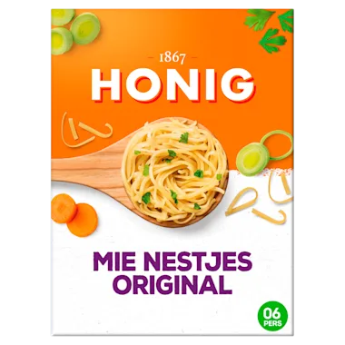 Honig Mie Nestjes zijn in 1950 geintroduceerd en sindsdien niet meer weg te denken uit de Nederlandse Keuken. Deze portie voor 6 personen staat binnen 10 minuten klaar! Variatietip: Voeg aan tafel een scheutje ketjap of chilisaus toe!