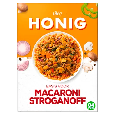 Honig basis voor Macaroni Stroganoff is een mix met lekkere kruiden en specerijen zoals knoflook, tijm en paprikapoeder. Door het toevoegen van verse ingrediënten zet je snel en makkelijk een heerlijke maaltijd op tafel!