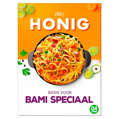 Honig basis voor Bami Speciaal is een mix met Oosterse kruiden en specerijen zoals laos, koriander en gemberwortel. Door het toevoegen van verse ingrediënten, zoals groenten en vlees, zet je snel en makkelijk een heerlijke bami op tafel. Deze mix is goed voor een maaltijd van 3 tot 4 personen en staat in slechts 20 minuten op tafel. Kook zoals de algemene bereidingswijze of serveer de bami met Wijko satesaus om te variëren. Vergeet niet om je eigen draai eraan te geven! Dus aan tafel met Honig!
