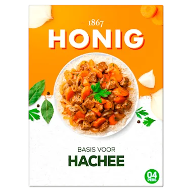 Honig basis voor Hachee is een maaltijdmix met kruiden en specerijen waarin onder andere kruidnagel en laurier zit. Door het toevoegen van verse ingrediënten, zoals groenten en vlees, zet je snel en makkelijk een heerlijk traditioneel Hollands vleesgerecht op tafel! Deze maaltijdmix is goed voor een maaltijd voor 4 personen en staat na 2,5 uur voorbereiden en stoven op tafel. Kook zoals de algemene bereidingswijze of roer twee eetlepels appelstroop door de hachee om te variëren. Vergeet niet om je eigen draai eraan te geven! Dus aan tafel met Honig!