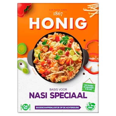 Met de Honig Base voor Nasi Speciaal als veelzijdige basis maak je makkelijk en snel een heerlijk rijstgerecht. In slechts 20 minuten zet je een snelle, lekkere en vullende maaltijd op tafel voor het hele gezin. Voeg zelf verse ingrediënten naar wens toe in combinatie met deze maaltijdmix en creëer zo eenvoudig jouw favoriete Oosterse klassiekers. Vol met natuurlijke ingrediënten en vol van smaak. Wat eten we vandaag? Honig nasi!