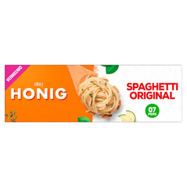 Honig Spaghetti Original is een spaghetti gemaakt van een extra kwaliteit tarwe, die zorgt voor een unieke smaak en beet. Honig Original is in 1933 geïntroduceerd en is sindsdien niet meer weg te denken uit de Nederlandse keuken. Door het toevoegen van verse ingrediënten, zoals rundergehakt en provencaalse wokgroenten, zet je snel en makkelijk een heerlijke, zelfgemaakte pastagerecht op tafel! Honig Spaghetti Original is geschikt voor 7 personen en staat binnen 10 minuten al op tafel. Bereid het pastagerecht zoals de algemene bereidingswijze of garneer het met wat geraspte kaas en basilicum om te variëren. Dus aan tafel met Honig!