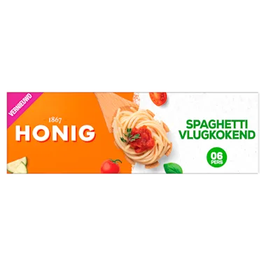Honig Spaghetti Vlugkokend is een spaghetti met een korte kooktijd. Hierdoor is het extra geschikt voor een snelle pastamaaltijd. Door het toevoegen van verse ingrediënten, zoals rundergehakt en provençaalse wokgroenten, zet je snel en makkelijk een heerlijke, zelfgemaakte pastagerecht op tafel! Honig Spaghetti Vlugkokend is geschikt voor 6 personen en staat al binnen 6 minuten op tafel. Bereid zoals de algemene bereidingswijze of garneer eventuaal met verse basilicum en geraspte kaas om te variëren. Dus aan tafel met Honig!