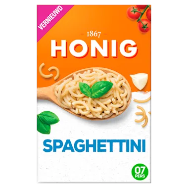 Honig Spaghettini is iets dikker en korter dan normale spaghetti waardoor het erg makkelijk te eten is. Ideaal voor kinderen! Door het toevoegen van verse ingrediënten, zoals rundergehakt en Italiaanse roerbakmix, zet je snel en makkelijk een heerlijke, zelfgemaakte pastagerecht op tafel! Honig Spaghettini is geschikt voor 7 personen en staat binnen 5 minuten al op tafel. Snel en gemakkelijk te bereiden met de vertrouwde smaak van Honig. Wil je een dagje zonder vlees? Vervang dan het rundergehakt door vegetarisch gehakt! Vergeet niet je eigen draai aan je maaltijd te geven en varieer met jouw favoriete sauzen en groenten! Dus aan tafel met Honig!