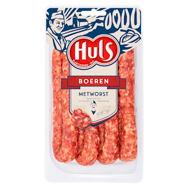 Huls Boerenmetworst is en stevige worst met een natuurlijke kruidenmelange. Traditioneel ambachtelijk bereid. Heerlijk voor bij de borrel of als tussendoortje.