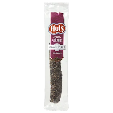Huls Lekker Gekruid Peper is een droge worst van top kwaliteit, omhuld met zwarte peper. Fijn van structuur.