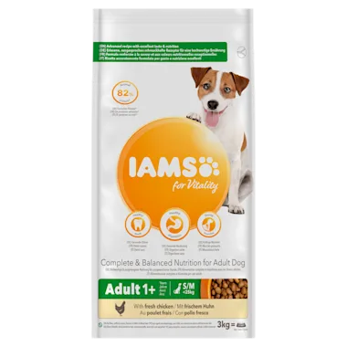 Voldoe aan de natuurlijke behoeften van uw volwassen hond met heerlijke geavanceerde voeding met 82% dierlijk eiwit [van het totale eiwitgehalte]. Ons IAMS Advanced Nutrition 1+ Years droogvoer met verse kip voor honden van kleine en middelgrote rassen is ontwikkeld met het DentalCare System, dat de tanden gezond houdt en de vorming van tandsteen vermindert. Bovendien ondersteunt een mengsel van antioxidanten, verrijkt met vitamine E, het immuunsysteem van volwassen honden, waardoor de algehele gezondheid en het afweersysteem worden versterkt. De aanwezige omega 3- en omega 6-vetzuren dragen bij aan een gezonde huid en vacht en laten de vacht van uw hond stralen. Het recept is samengesteld met belangrijke voedingsstoffen om het hart te voeden voor een sterke hartspier. Kies IAMS om uw trouwe metgezel niet alleen de noodzakelijke voeding te geven, maar ook te verwennen met de voeding die hij echt verdient
