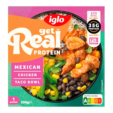 Maaltijd 1 portie stukjes kipfilet met rijst, kidneybonen, maïskorrels, paprika en een Mexicaanse stijl saus. Diepvries.