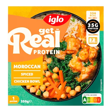 Maaltijd 1 portie stukjes kipfilet met kikkererwten, rijst, spinazie, wortel en een Marokkaanse stijl saus. Diepvries.
