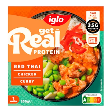 Maaltijd 1 portie stukjes kipfilet met rijst, sojabonen, paprika, bamboescheuten, kikkererwten en een pittige Thaise stijl saus. Diepvries.
