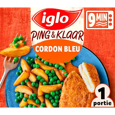 Iglo Ping & Klaar Cordon Blue, een heerlijke 1-persoonsmaaltijd geserveerd met gebakken aardappeltjes en erwtjes.