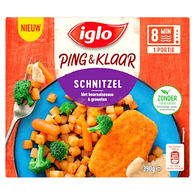 Iglo Ping & Klaar Schnitzel, een heerlijke 1-persoonsmaaltijd geserveerd met een bernaise saus, groente en gebakken aardappeltjes.