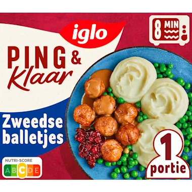 Iglo Ping & Klaar Zweedse balletjes, een heerlijke 1-persoonsmaaltijd met Zweedse balletjes, smeuïge aardappelpuree en erwtjes.
