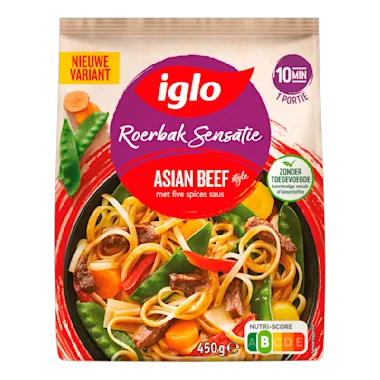 Iglo Roerbak Sensatie is een 1-persoonsmaaltijd in een handomdraai. Binnen 10 minuten heerlijke noedels met groenten en rundvlees in een 5 spices saus op tafel. Alleen even roeren en eet smakelijk!