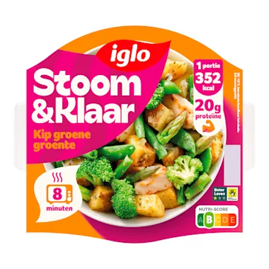 Iglo Stoom & Klaar Kip Groente Groente is een heerlijke 1-persoonsmaaltijd zó klaargestoomd! Door de maaltijd te stomen proef je de pure smaak van de groene groente en blijft de kipfilet lekker mals!