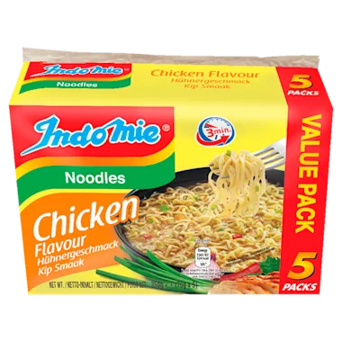 Ingrediënten: Noodles 94%: TARWE-Meel, geraffineerde palmolie (geraffineerde palmolie, antioxidant E319), zout, zuurteregelaars : E452, E501, E500, verdikkingsmiddel: E412, kleurstof: E101; Kruidenpoeder 5,6%: Zout, smaakversterkers: E621, E631, E627, suiker, aroma (bevat SOJA, SELDERIJ), witte peper, knoflook, antiklontermiddel: E551, gember; Chilipoeder 0,4%.