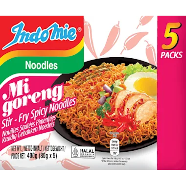 Ingrediënten: Noedels 83,7%: TARWE-meel, geraffineerde palmolie (geraffineerde palmolie, antioxidant E319), zout, zuurteregelaars: E452, E500, E501 , verdikkingsmiddel: E412, kleurstof: E101; Kruidenolie 6,0%: Geraffineerde palmolie (geraffineerde palmolie, antioxidant E319), chili, knoflook, sjalot, paprika; Kruidenpoeder 4,7%: Zout, suiker, aroma (bevat SOJA, GLUTEN, SELDERIJ), smaakversterkers: E621, E631, E627, ui, knoflook, antiklontermiddel: E551; Zoete Sojasaus 3,6%: Suiker, water, zout, TARWE, SOJA, specerijen, SESAM-olie; Gebakken Sjalot 1,2%: Sjalot, geraffineerde palmolie (geraffineerde palmolie, antioxidant E319); Chilipoeder 0,8%.