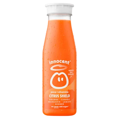 appelsap, sinaasappelsap (25%), mandarijnensap (20%), wortelsap (19%), citroensap (1,5%), gemberextract (0,5%), wat vitamines (B1, B2, B6, C, E en niacine)