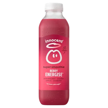 3 ½ geperste appel (50%), 24 geperste druiven, 2 geplette bananen, 6 geplette aardbeien (10%), 6 geplette zure kersen (3,3%), 24 geplette zwarte bessen (3%), een scheutje rode bietensap, een beetje cichoreiwortelextract, wat gemalen lijnzaad (0,11%), wat vitamines (B1, B2, B6, C, E, niacine), een vleugje guarana-infusie (0,01%)
