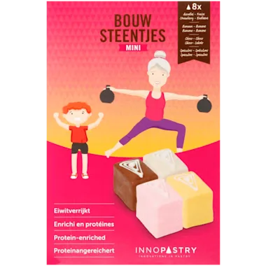 Eiwitverrijkt gebakje van zacht biscuit en slagroom, overtrokken met zacht glazuur. Verschillende smaken: aardbei, banaan, speculoos en choco. Diepvries