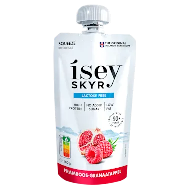Ísey Skyr Framboos - Granaatappel is proteïnerijke skyr volgens traditioneel IJslands recept in een handig knijpzakje.