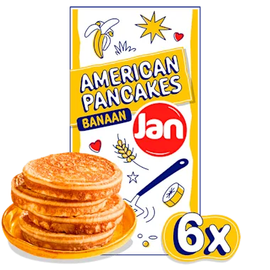 Deze American style bananen pancakes van Jan bevatten meer dan 25% bananenpuree. Verwen jezelf met de heerlijke bananen pancakes als ontbijt, brunch of lunch. De pancakes zijn het allerlekkerst als je ze even flipt in de pan of verwarmt in de broodrooster. Maar ze zijn ook heel lekker om koud te eten, bijvoorbeeld onderweg. Handig!