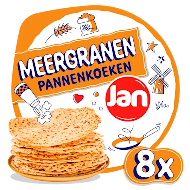 Acht meergranenpannenkoeken, lekker met poedersuiker en stroop of juist hartig met kaas of spek. Dankzij de meergranen zijn ze niet alleen voedzaam, maar ook extra smaakvol! Even opwarmen in de koekenpan, flippen, en klaar – of snel in de magnetron, en genieten maar! Want vrolijke gezichten aan tafel, daar worden we blij van! Daarom bakt Jan zijn pannenkoeken op ambachtelijke wijze, precies zoals zijn moeder dat deed.