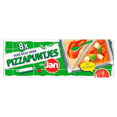 Bereidingsinstructies: 1. Verwarm de oven op 200°C (hetelucht). Haal de bakplaat uit de oven en beleg deze met een vel bakpapier. 2. Haal het deeg uit de verpakking. Verwijder het etiket van de koker en haal het deeg uit de verpakkinge door de koker te draaien. 3. Rol het deeg uit en snijd het deeg op de stippellijnen zodat er deegpuntjes ontstaan. 4. Leg de puntjes op een bakplaat en besmeer ze met een dun laagje tomatensaus. Beleg vervolgens met verse ingrediënten naar keuze. Om het deeg goed te laten rijzen is het belangrijk de puntjes niet te zwaar te beleggen. 5. Plaats de bakplaat met de belegde puntjes in de oven en bak deze in 10 tot 12 minuten af (190°C) tot de randjes goudbruin zijn. De baktijd kan langer zijn, afhankelijk van de oven en het gekozen beleg.