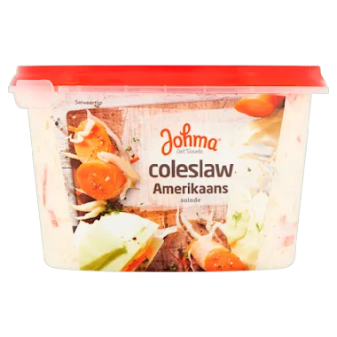 Ingrediënten: 50% witte kool, koolzaadolie, water, 6% wortel, ui, suiker, natuurazijn, bieslook, gepasteuriseerd EIGEEL, zout, gemodificeerd zetmeel, verdikkingsmiddelen (guarpitmeel, xanthaangom), conserveermiddelen (kaliumsorbaat, natriumbenzoaat), specerijen (MOSTERD), antioxidanten (ascorbinezuur, citroenzuur), gistpoeder, voedingszuur (azijnzuur). Kan sporen bevatten van gluten, melk, noten, pinda's, sesamzaad, schaaldieren, selderij, soja en vis.