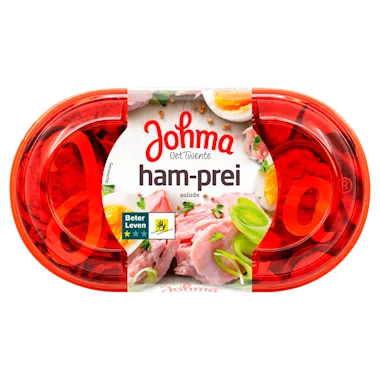 Onze golden oldie in een nieuw jasje! Romig van smaak met een frisse twist. Boordevol stukjes ei, reepjes ham en preiringen is deze salade een heerlijke traktatie voor op je broodje bij de lunch. Deze salade bevat 1 ster BLK ham. Over Johma, Johma is de bekendste en grootste saladebereider van Nederland en kent een ruime geschiedenis. Al sinds 1968 komen de lekkerste salades uit de keukens van Johma. Bij het maken van haar salades heeft Johma steeds maar één doel voor ogen: Johma moet gewoon de allerlekkerste zijn! Johma maakt salades die lekker zijn op de boterham, stokbroodje, broodje of op een toastje. Zoals bijvoorbeeld de tonijnalade of de kip-kerriesalade. Lekker en makkelijk, als ontbijt, lunch of voor bij de borrel. Maar daarnaast heeft Johma ook aardappelsalades en rauwkost salades.