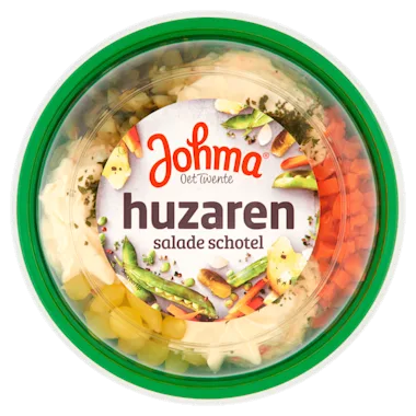 Ingrediënten: 41% gestoomde aardappel, water, koolzaadolie, 9% wortel, 8% augurk, 5% zilverui, suiker, 2% ui, natuurazijn, peterselie, 1% doperwten, 1% gekookt rundvlees, gemodificeerd zetmeel, zout, gepasteuriseerd EIGEEL, specerijen (MOSTERD), aroma's (SELDERIJ), conserveermiddelen (kaliumsorbaat, natriumbenzoaat), zetmeel,
