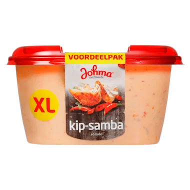 Johma kip-sambasalade is lekker zoete salade met een pittige twist. Deze salade combineert malse stukjes kip met een romige, licht pittige dressing. Perfect voor op brood of toast. Lekker voor op elk moment van de dag. Recepttip: Maak een lekkere lunchwrap door een tortilla te besmeren met een royale laag Johma kipsambasalade. Voeg wat plakjes avocado, een handje rucola en een paar schijfjes tomaat toe. Rol de tortilla op en geniet van een snelle, smakelijke lunch! Over Johma, Johma is de bekendste en grootste saladebereider van Nederland en kent een ruime geschiedenis. Al sinds 1968 komen de lekkerste salades uit de keukens van Johma. Bij het maken van haar salades heeft Johma steeds maar één doel voor ogen: Johma moet gewoon de allerlekkerste zijn! Johma maakt salades die lekker zijn op de boterham, stokbroodje, broodje of op een toastje. Zoals bijvoorbeeld de eisalade of de kip-kerriesalade. Lekker en makkelijk, als ontbijt, lunch of voor bij de borrel. Maar daarnaast heeft Johma ook aardappelsalades en rauwkost salades.
