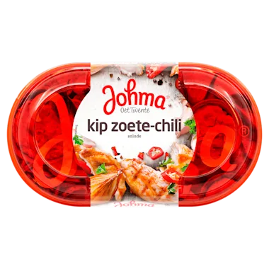 Ontdek onze heerlijke kip-zoetechilisalade. Malse stukjes kip in onze zoete huisgemaakte chilisaus, knoflook, verse kruiden en een gebakken uitje. De perfecte combinatie van zoet en licht pittig! Bevat moederdieren kip van Europese herkomst. Over Johma, Johma is de bekendste en grootste saladebereider van Nederland en kent een ruime geschiedenis. Al sinds 1968 komen de lekkerste salades uit de keukens van Johma. Bij het maken van haar salades heeft Johma steeds maar één doel voor ogen: Johma moet gewoon de allerlekkerste zijn! Johma maakt salades die lekker zijn op de boterham, stokbroodje, broodje of op een toastje. Zoals bijvoorbeeld de tonijnalade of de kip-kerriesalade. Lekker en makkelijk, als ontbijt, lunch of voor bij de borrel. Maar daarnaast heeft Johma ook aardappelsalades en rauwkost salades.