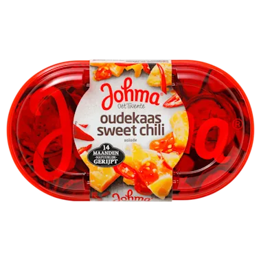 Johma oudekaas-sweet-chilisalade is bereid met 14 maanden gerijpte oude kaas. De kaas is hierdoor heerlijk smaakvol en is tevens lekker smeuïg. De rode pepers in de salade zorgen voor een beetje meer pit. Zoet en pittig tegelijk: genieten maar! Over Johma, Johma is de bekendste en grootste saladebereider van Nederland en kent een ruime geschiedenis. Al sinds 1968 komen de lekkerste salades uit de keukens van Johma. Bij het maken van haar salades heeft Johma steeds maar één doel voor ogen: Johma moet gewoon de allerlekkerste zijn! Johma maakt salades die lekker zijn op de boterham, stokbroodje, broodje of op een toastje. Zoals bijvoorbeeld de tonijnalade of de kip-kerriesalade. Lekker en makkelijk, als ontbijt, lunch of voor bij de borrel. Maar daarnaast heeft Johma ook aardappelsalades en rauwkost salades.