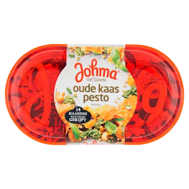 Dat oudekaas en pesto een goede combinatie is dat wisten ze ook in Twente. Daarom maakte ze van deze welkebekende combinatie een salade. Deze salade is gemaakt van 14 maanden traditioneel gerijpte kaas en groene pesto. De krachtige oude kaas en smeuige pesto van basilicum, cashewnoten en pijnboompitjes geeft deze salade extra veel pit! Over Johma, Johma is de bekendste en grootste saladebereider van Nederland en kent een ruime geschiedenis. Al sinds 1968 komen de lekkerste salades uit de keukens van Johma. Bij het maken van haar salades heeft Johma steeds maar één doel voor ogen: Johma moet gewoon de allerlekkerste zijn! Johma maakt salades die lekker zijn op de boterham, stokbroodje, broodje of op een toastje. Zoals bijvoorbeeld de tonijnalade of de kip-kerriesalade. Lekker en makkelijk, als ontbijt, lunch of voor bij de borrel. Maar daarnaast heeft Johma ook aardappelsalades en rauwkost salades.
