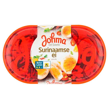 Johma Surinaamse eisalade is een eisalade met pit! Een lekkere salade rijkgevuld met ei. De toegevoegde sambal geeft de pittige smaak aan de salade. Lekker voor tijdens de lunch, brunch of borrel. Over Johma, Johma is de bekendste en grootste saladebereider van Nederland en kent een ruime geschiedenis. Al sinds 1968 komen de lekkerste salades uit de keukens van Johma. Bij het maken van haar salades heeft Johma steeds maar één doel voor ogen: Johma moet gewoon de allerlekkerste zijn! Johma maakt salades die lekker zijn op de boterham, stokbroodje, broodje of op een toastje. Zoals bijvoorbeeld de tonijnalade of de kip-kerriesalade. Lekker en makkelijk, als ontbijt, lunch of voor bij de borrel. Maar daarnaast heeft Johma ook aardappelsalades en rauwkost salades.