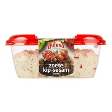 Nieuw van Johma: zoete kip-sesamsalade! Een kipsalade met malse 1 ster Beter Leven kipstukjes in een zoet-pittige saus vol umami-smaken. Een frisse salade met knapperige stukjes komkommer. Samen met de smaak van sesam behoort deze salade tot echt comfort food. ​Lekker bij de lunch, borrel of als tussendoortje! Over Johma oet Twente Johma is de bekendste en grootste saladebereider van Nederland en kent een ruime geschiedenis. Al sinds 1968 komen de lekkerste, verse salades uit de keukens van Johma. Bij het maken van haar salades heeft Johma steeds maar één doel voor ogen: Johma moet de lekkerste zijn! Sinds de jaren '70 is Johma gevestigd in Losser, Twente en worden daar de salades met veel passie en vakmanschap bereid. Gemaakt met Noaberschap noemen we dat in Twente. Johma maakt nog altijd salades die lekker zijn op brood of bijvoorbeeld op een wrap, cracker of op een toastje. Lekker en makkelijk, als ontbijt, lunch, tussendoortje of voor bij de borrel. Daarnaast maakt Johma ook aardappel- en rauwkostsalades voor bij de BBQ of tussendoor. De aardappelsalades vind je in het schap bij de brood & toastsalades. De rauwkostsalades vind je in het schap bij de voorverpakte groente.