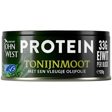 Met John West PROTEIN heb je een heerlijke tonijnmoot, van nature rijk aan eiwitten met 33g eiwit per blik. Verantwoord gevist volgens het MSC keurmerk. Uitlekken niet nodig en ideaal als lunch, tussendoor of voor na het sporten.