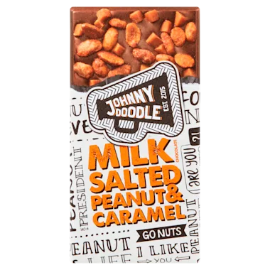 Melkchocolade bestrooid met gekarameliseerde en gezouten pinda's