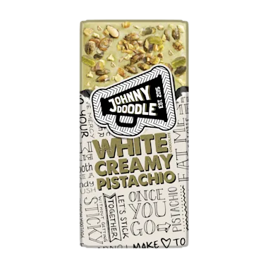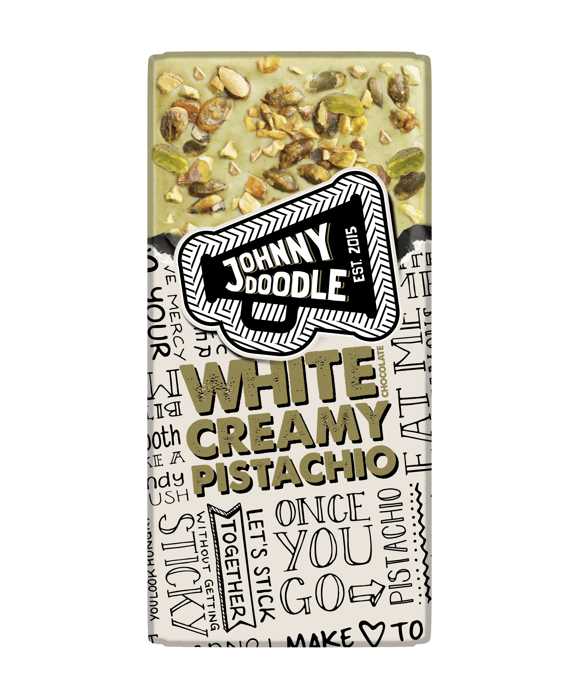 Witte chocolade met pompoenpitten- en pistachepasta bestrooid met gekarameliseerde pompoenpitten en pistachenoten.