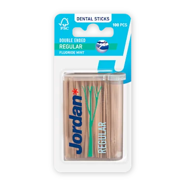 De Jordan Dental Sticks Double Ended Regular bevat dubbelzijdige tandenstokers met mintsmaak en toegevoegde fluoride. De tandenstokers zijn geschikt voor mensen met normale tot wijde interdentale ruimtes.