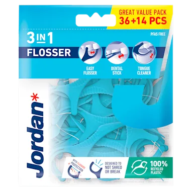 Jordan 3-in-1 Flosser is een wegwerp floss die het gemakkelijk maakt om een mooie glimlach te krijgen. 3-in-1 Flosser voor 100% hygiëne tussen de tanden. De gewaxte floss verwijdert plaque effectief. De unieke tongschraper verwijdert bacteriën op de tong en zorgt voor een frisse adem. Daarnaast verwijdert de tandenstoker etensresten en stimuleert het tandvlees.