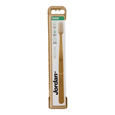 Jordan Green Clean combineert geweldige functionaliteit, modern design en duurzame materialen. In het ontwerpproces wordt niets aan het toeval overgelaten en worden alle materialen zorgvuldig geselecteerd met oog voor het milieu. Deze duurzame tandenborstel is gemaakt van 100% gerecycled plastic en 100% bio-gebaseerde borstelharen. De unieke verpakking is gemaakt van gerecyclede papiervezels. De tandenborstel heeft een moderne en minimalistische uitstraling, waarbij alleen de noodzakelijke materialen gebruikt worden die nodig zijn om een comfortabele poetservaring te garanderen. Deze tandenborstel heeft medium borstelharen. Verkrijgbaar in 4 verschillende kleuren.
