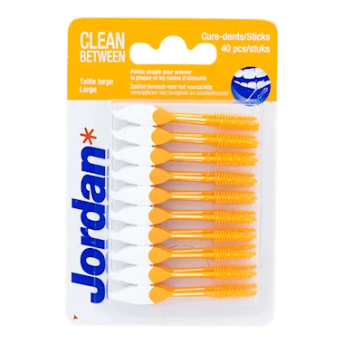 Jordan Clean Between Sticks voor het voorzichtig verwijderen van tandplak en voedselresten. Gemakkelijk in gebruik: voeg de stoker voorzichtig in de ruimtes tussen de tanden en maak zachte heen-en-weer gaande bewegingen. De flexibele borstelharen helpen tandplak en voedselresten te verwijderen. Niet forceren in nauwe ruimtes tussen de tanden. Door Clean Between Sticks te gebruiken, masseert en stimuleert u effectief uw tandvlees. Dit helpt u om een gezond gebit en tandvlees te behouden en geeft u een fris en schoon gevoel. Je kunt kiezen uit de varianten blauwe Regular (normaal) en oranje Large (groot), beide zijn op smaak gebracht met munt en bevatten fluoride.